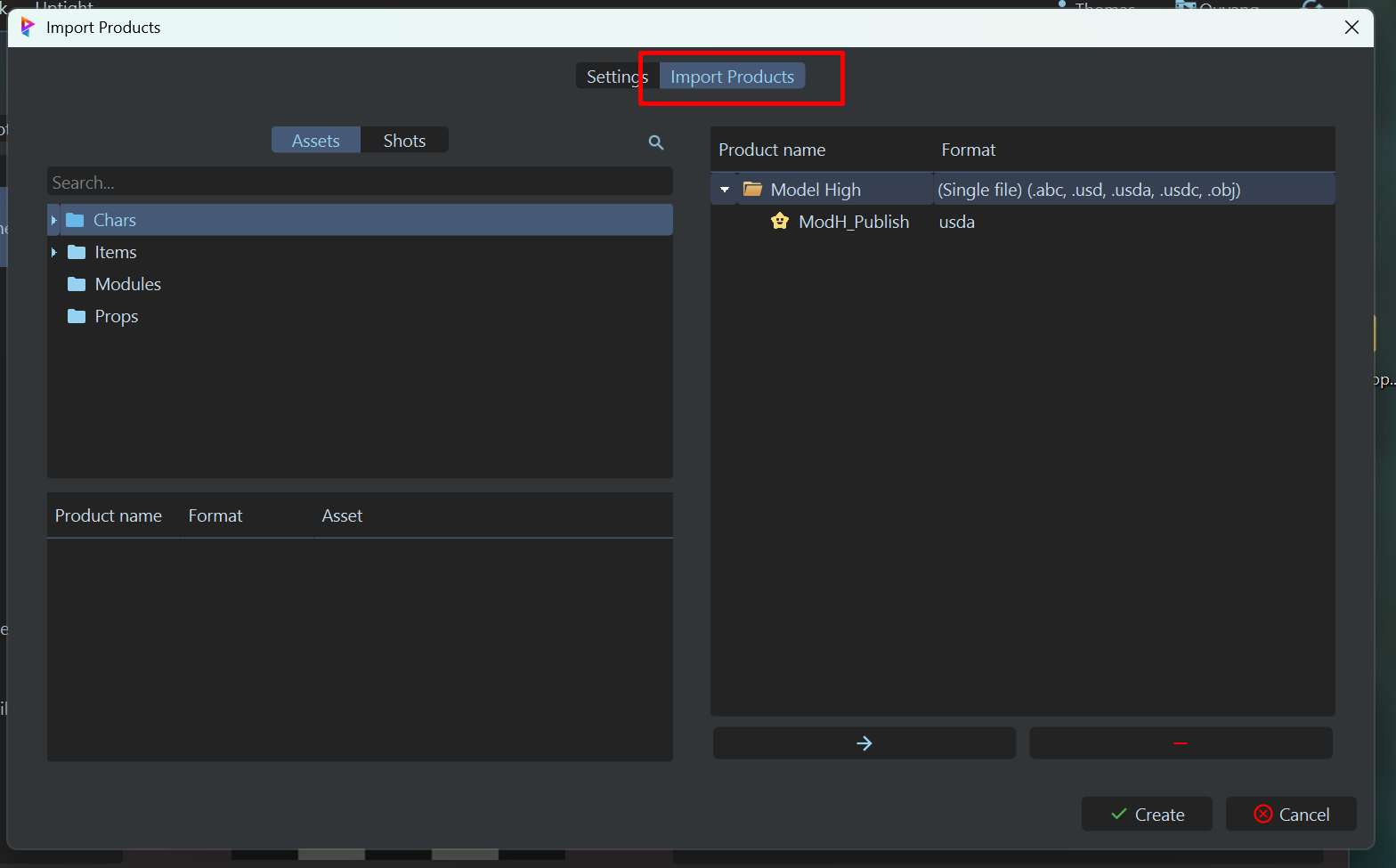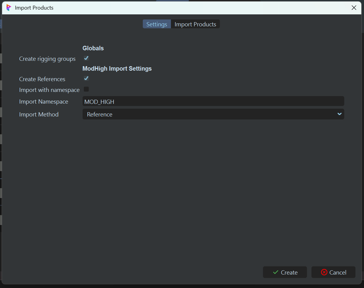 ". C'est la page qui sert à affiner les products qui seront importées dans la scène au cas ou l'algorithme passe à coté de quelque chose. Ici, on vas importer nos modeling low comme base pour nos rig low. Lisez la documentation pour plus de détails sur cette page.