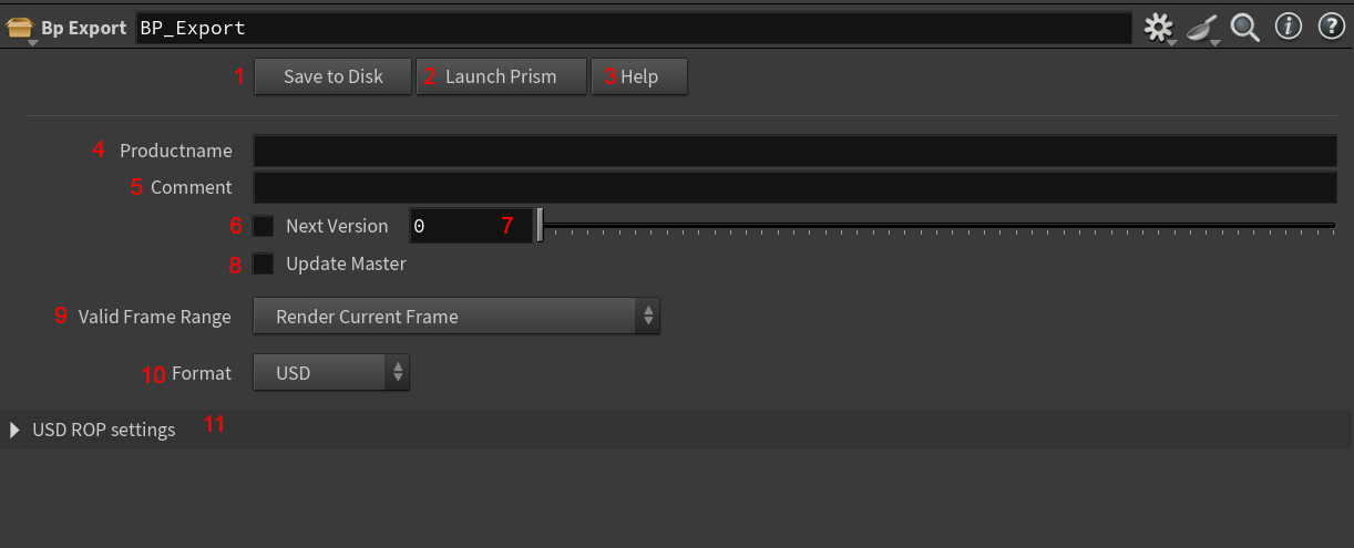 - Save to Disk : Exporte le fichier USD dans prism selon les paramètres suivants.