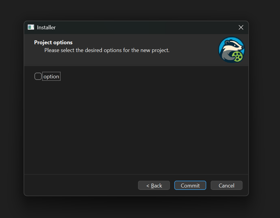 - Choisissez les options de votre projet. Pour l'instant, il n'y en a pas. Peut-être dans le futur. Cliquez sur le bouton "