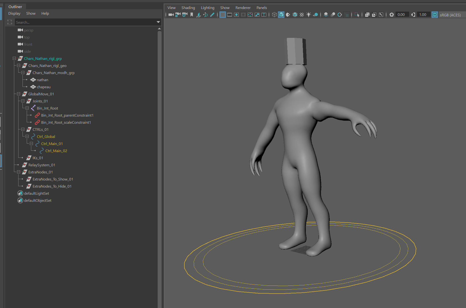 Dans Maya, une hiérarchie devrait déjà être présente, avec les assets correctement importés, et un rig simple mais fonctionnel.